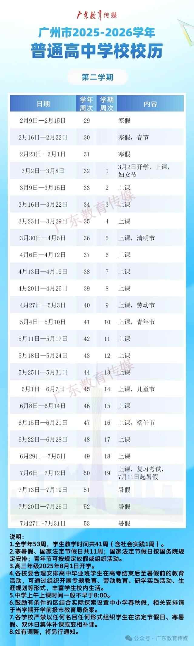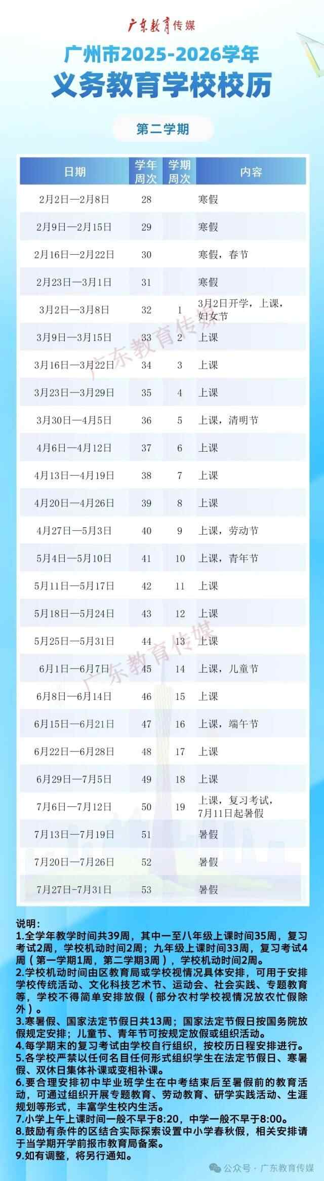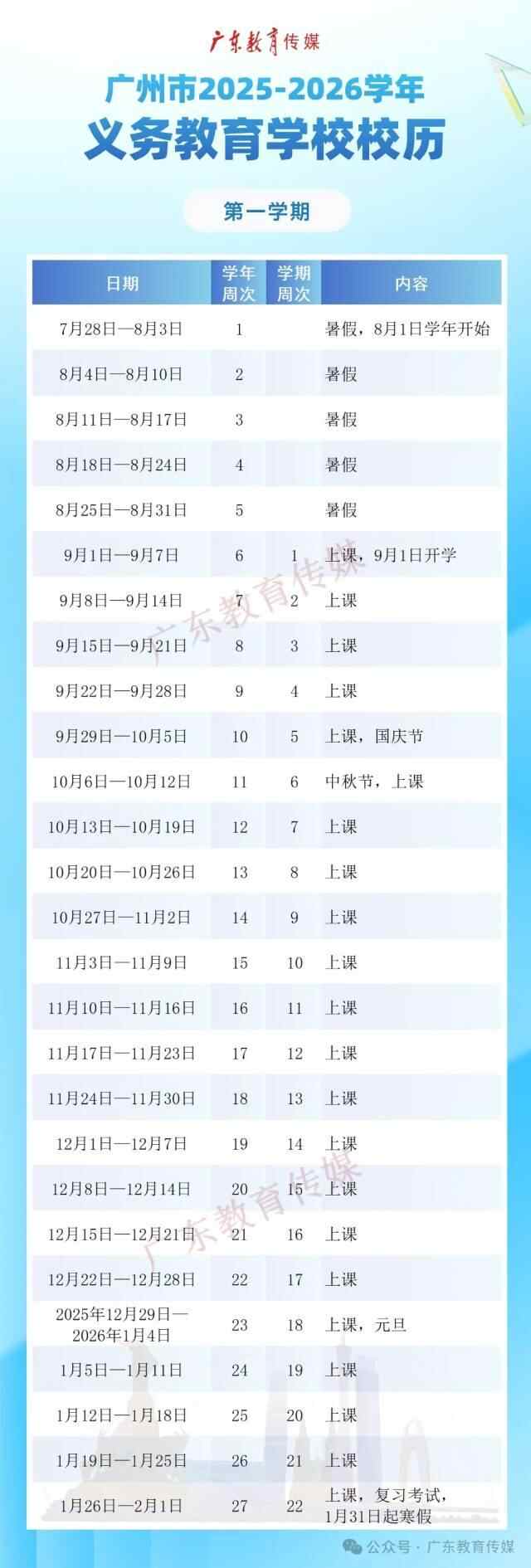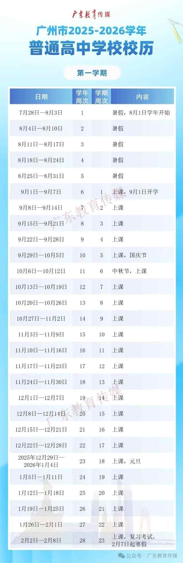 根据广州市教育局印发的2025-2026学年普通中小学校校历显示,义务教育学校寒假起始时间为2026年1月31日,普通高中学校寒假起始时间为2026年2月7日,春季学期开学时间均为2026年3月2日,暑假起始时间均为2026年7月11日。