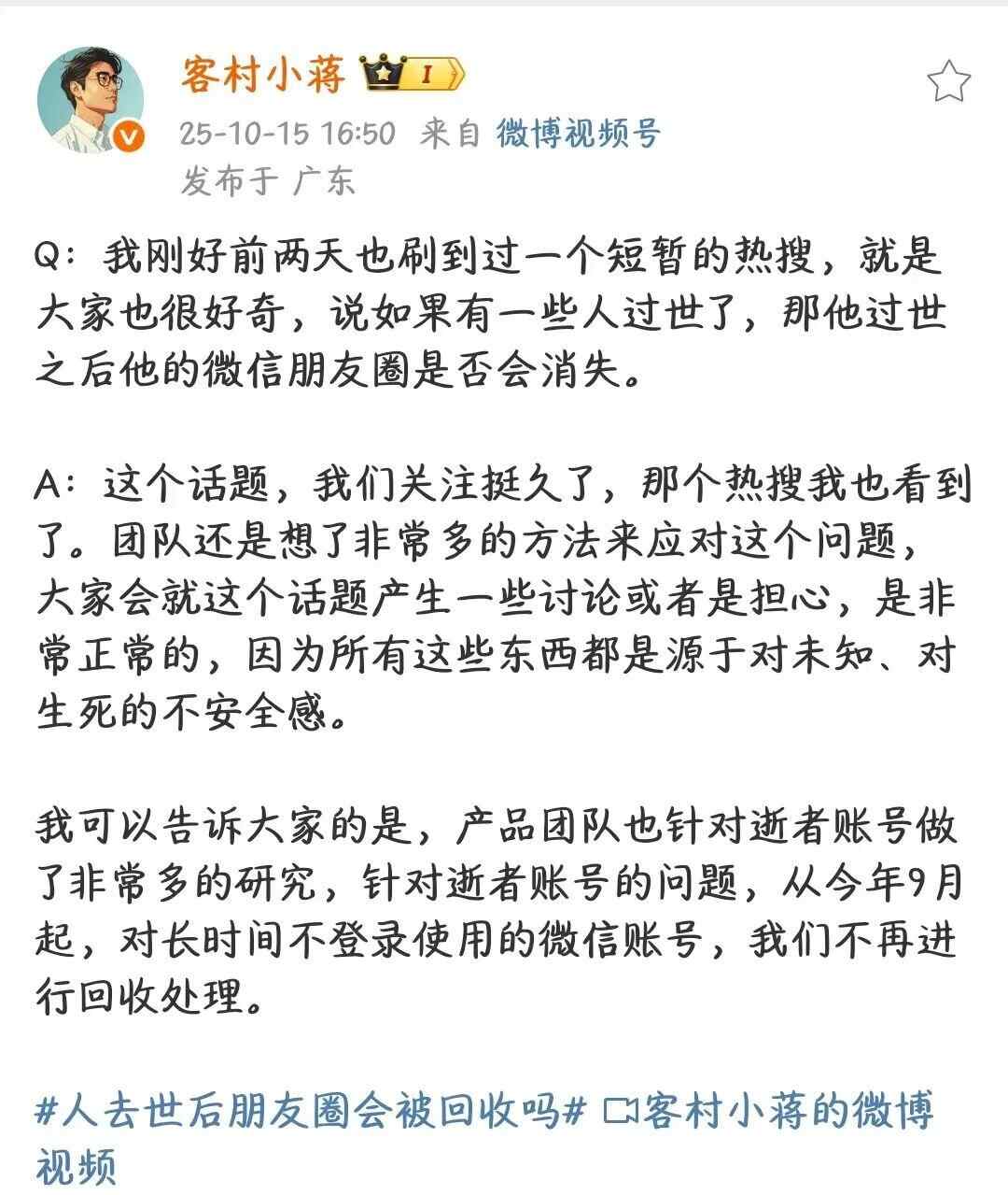 此外,15日下午,微信员工@客村小蒋也表示,微信产品团队经过研究,针对逝者账号的问题,从今年9月起,对长时间不登录使用的微信账号,微信不再进行回收处理。
