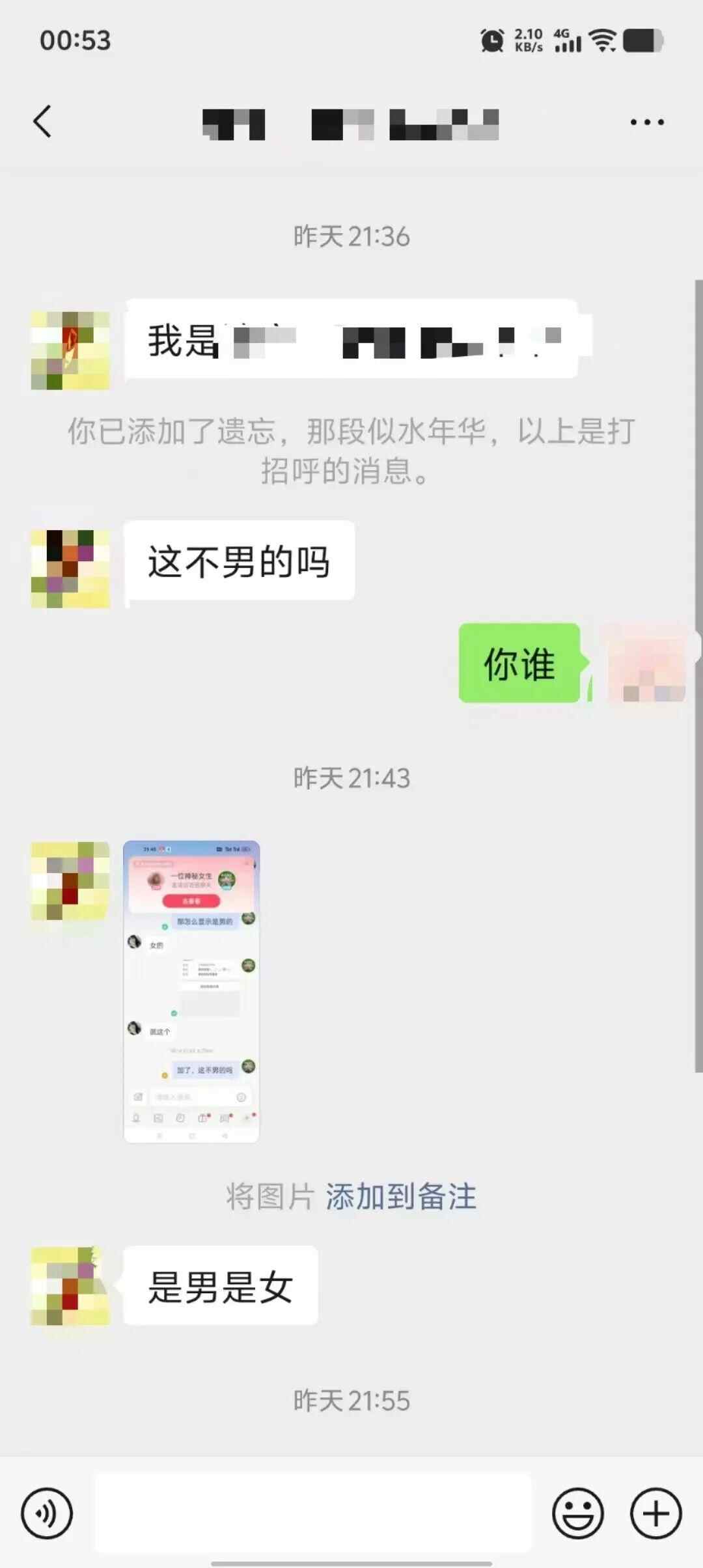 杨先生与父亲做完笔录回家已是15日凌晨,警方通知其15日中午去警局拿立案告知书。而当杨先生拿完立案告知书回家后,发现母亲的信息也被泄露。在杨先生分享的一段聊天记录中可见,一男子添加杨先生母亲微信后,展示了在探探平台上的聊天记录,男子聊天的对方头像是杨先生母亲的照片,探探名则是“三十一号楼”(杨先生家住址楼栋)。
