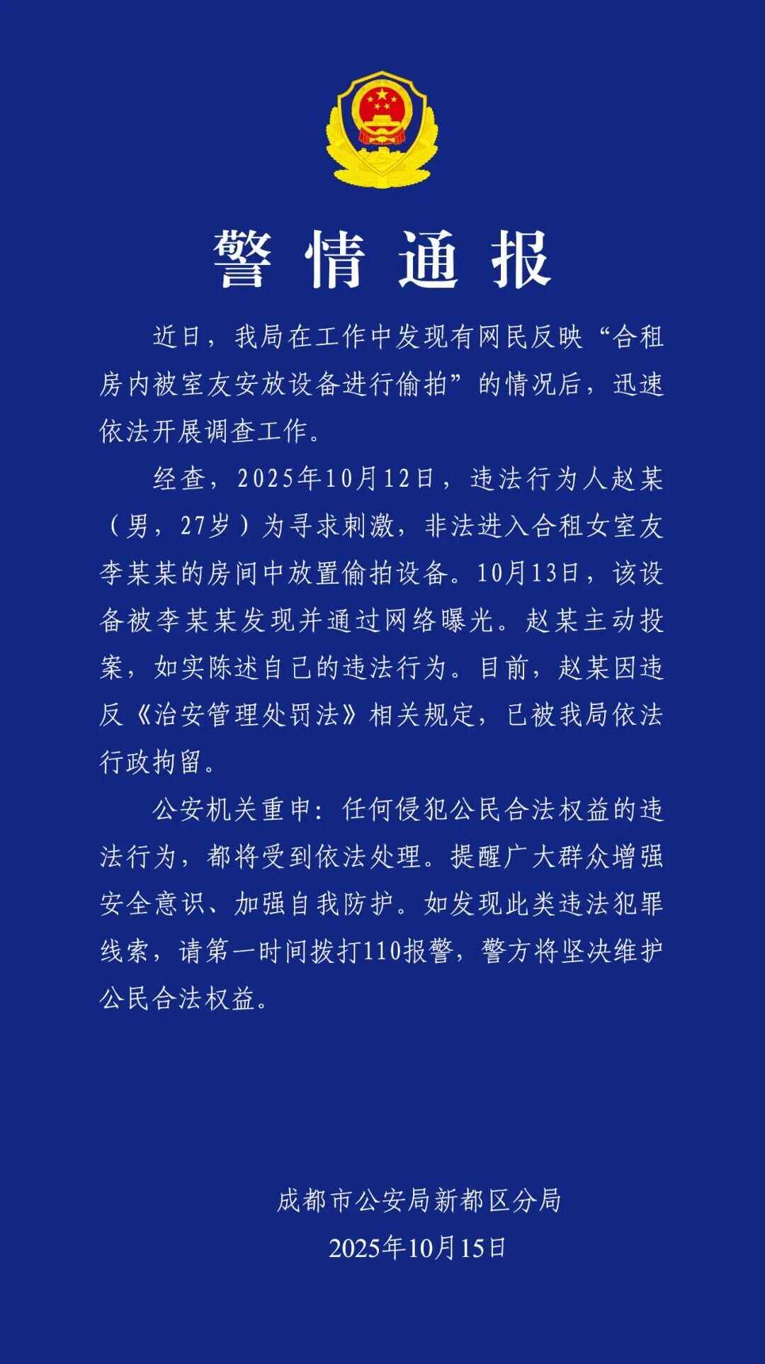 近日,我局在工作中发现有网民反映“合租房内被室友安放设备进行偷拍”的情况后,迅速依法开展调查工作。