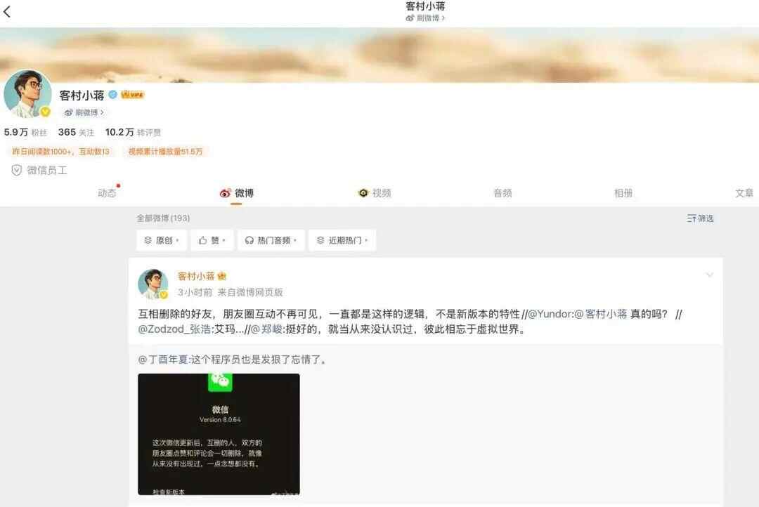 对此,微博认证为微信员工的转发该网友的推文并表示:“互相删除的好友,朋友圈互动不再可见,一直都是这样的逻辑,不是新版本的特性。”