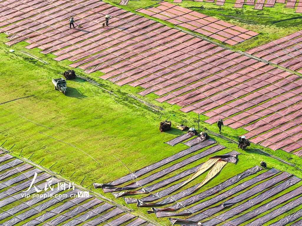 2025年10月12日,在广西梧州市蒙山县蒙山镇的一家丝绸企业晒场内,工人们趁天气晴朗,忙着翻晒、卷收香云纱。