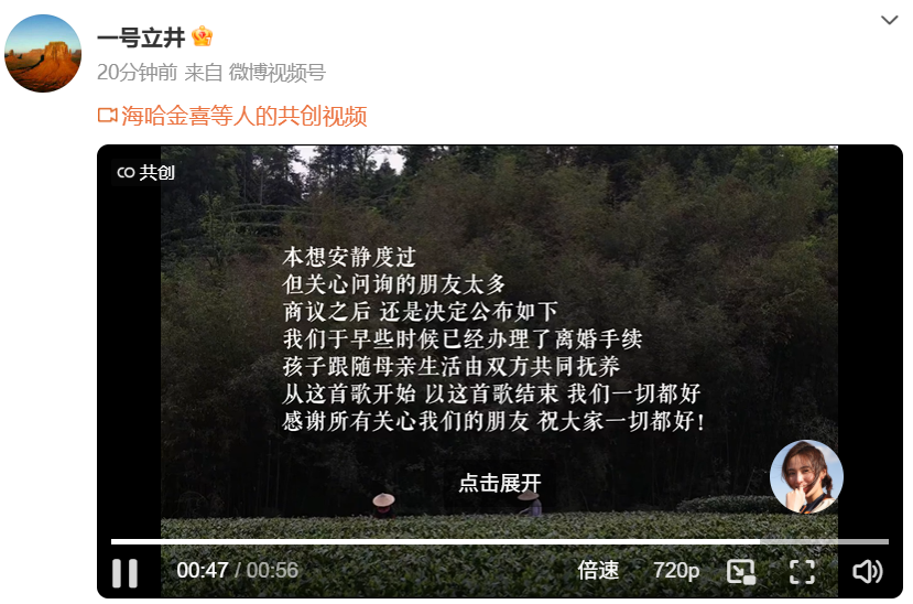 10月14日,李亚鹏通过@一号立井 微博宣布与海哈金喜离婚。