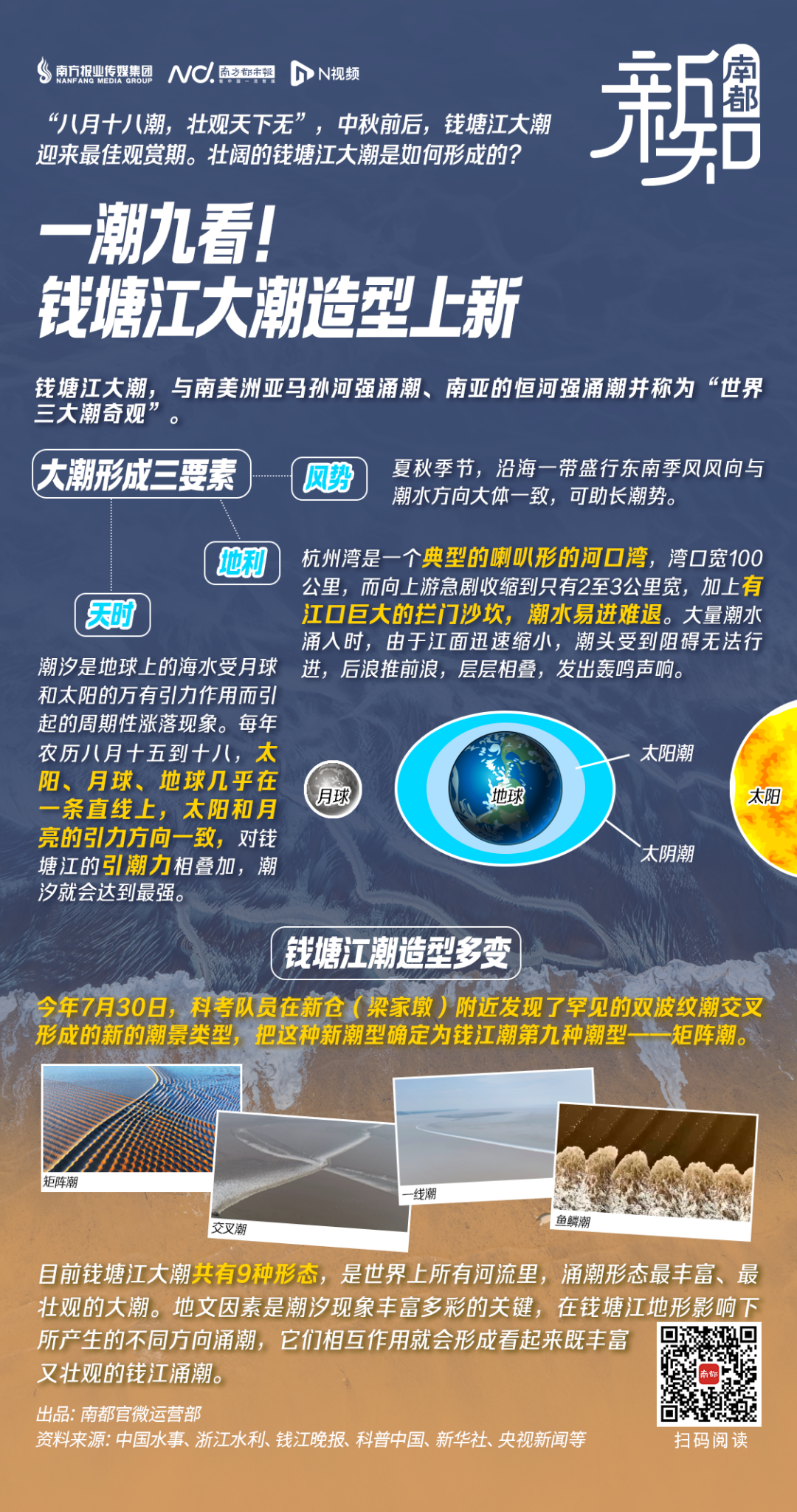 钱塘潮为何造型多变?“天文因素是潮汐汹涌的成因,而地文因素是潮汐现象丰富多彩的关键。”浙江省天文学会秘书长朱光良表示,钱塘江江底地形变化莫测,受钱塘江地形的影响,钱江涌潮并非只有一个方向,而是会产生不同方向的涌潮,这些不同方向涌潮相互影响、相互作用,就会形成看起来既丰富又壮观的钱江涌潮。