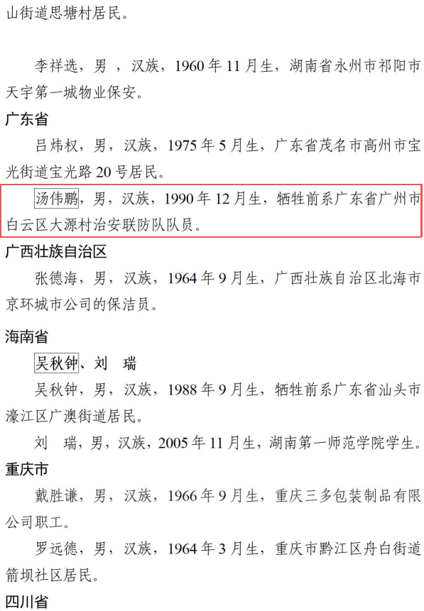 汤伟鹏,男,汉族,1990年12月生,牺牲前系广东省广州市白云区大源村治安联防队队员。