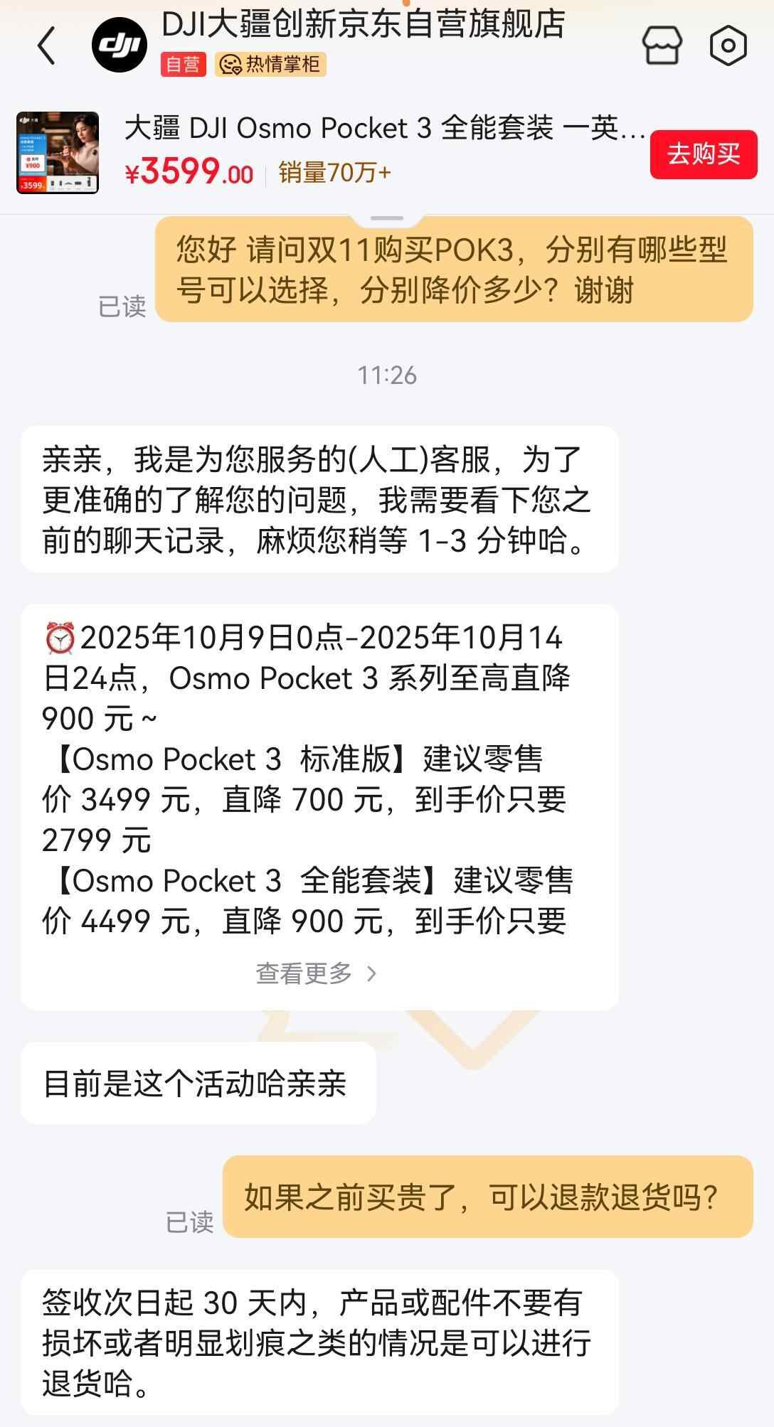 如果买贵,可以退货吗?10月9日上午11时许,记者与大疆京东自营旗舰店客服对话,客服回应记者称,该店铺在售的 Osmo Action 系列、Osmo Pocket 系列可拆封激活试用,消费者可以体验各项功能。如果签收次日起 30天内,产品或配件无损坏或者明显划痕之类的情况,是可以进行退货的。