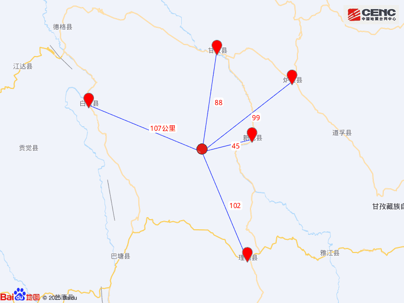 周边县城:震中距新龙县45公里、距甘孜县88公里、距炉霍县99公里、距理塘县102公里、距白玉县107公里,距甘孜藏族自治州220公里,距成都市404公里。