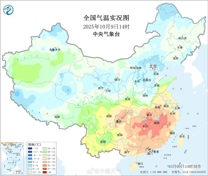 根据中央气象台10月9日15时45分天气预报,北京和杭州一北一南的温差超过了20℃。