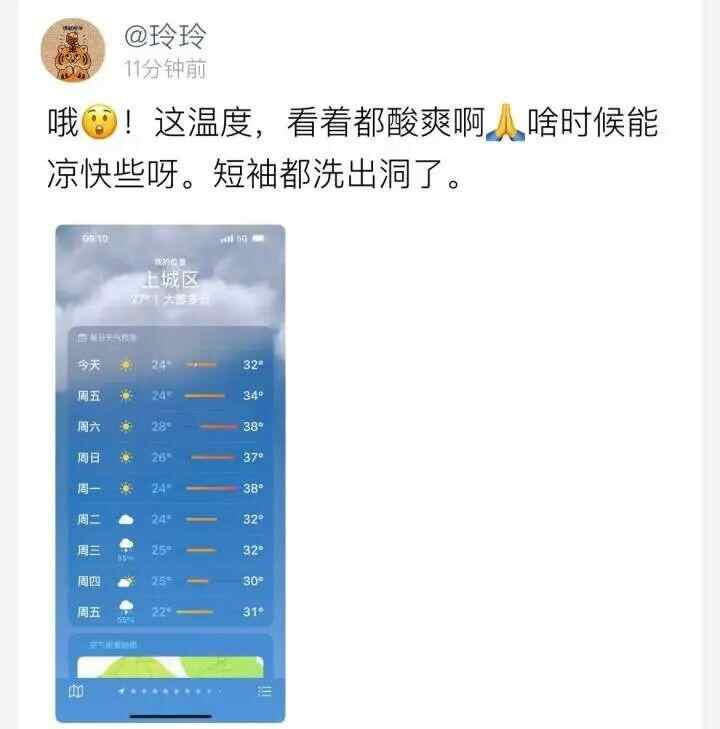 而在南边,都已经是“寒露”节气了,现在依旧短袖短裤都嫌热。一名杭州上城区的网友吐槽:“啥时候能凉快些呀,短袖都洗出洞了。”