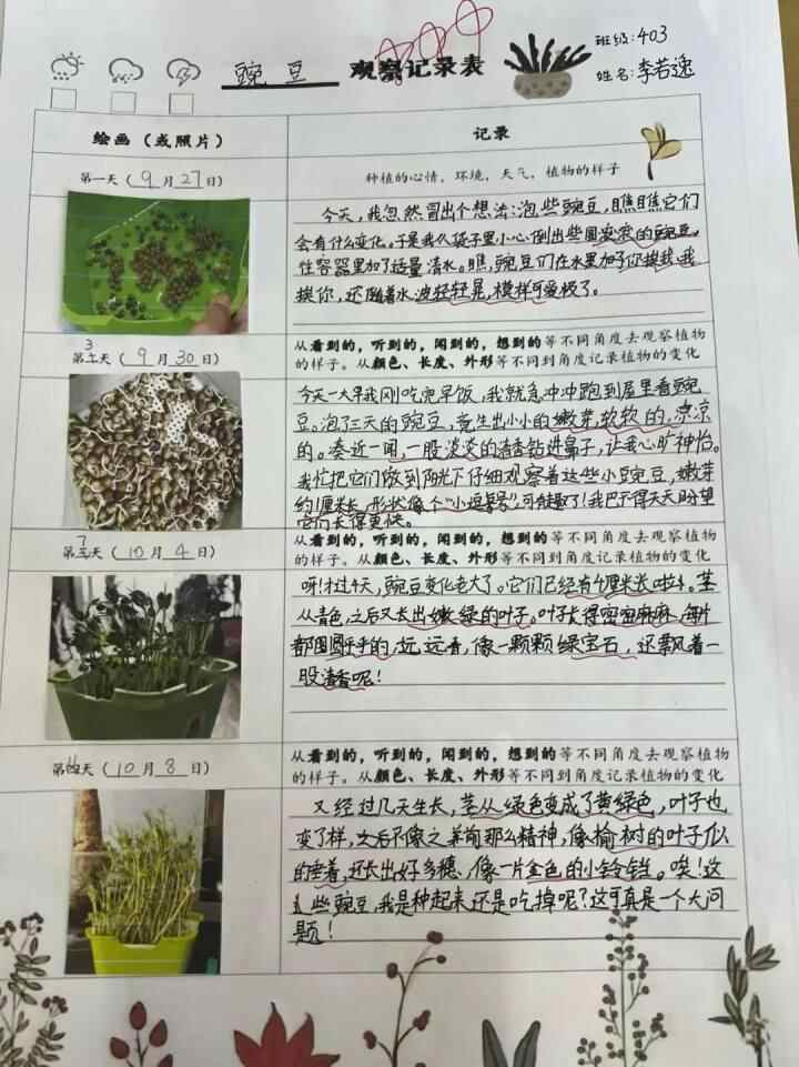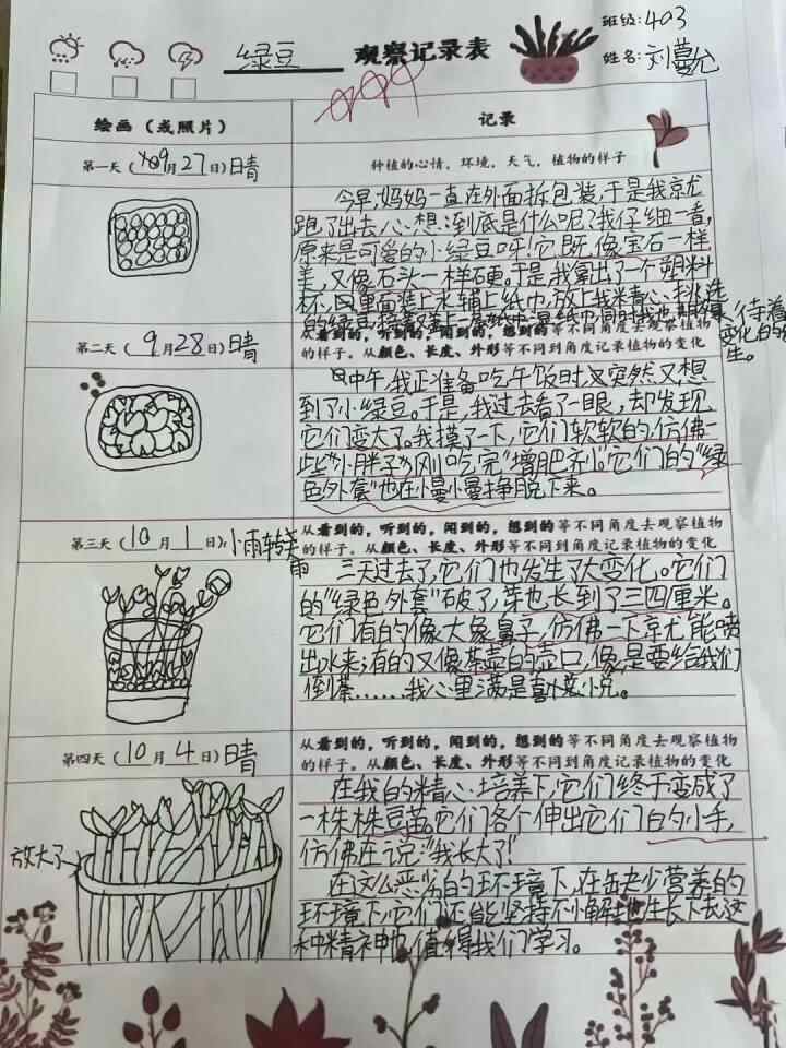 不过在布置作业时,很多老师的要求不仅限于绿豆,学生也可以观察其他的植物,或者一周的天气变化,小动物的成长变化等等。比如在朴老师的班上,有的孩子到云南大理旅游,记录了大理的天气变化,有的没出门,就记录了国庆期间钱塘江潮水的变化。家长和孩子可以根据自身情况灵活选择。