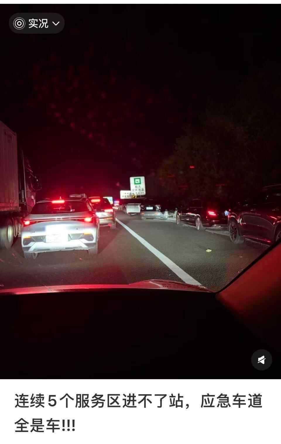 湖南段的高速受到大量网友的吐槽,许多服务区排起长队,车辆难以进去。7日上午,一位IP地址显示在湖南的网友提到,自己连续尝试进入5个服务区均未成功,就连应急车道上也停满了车辆。