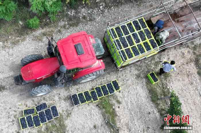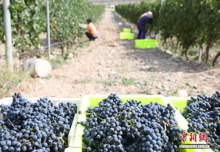 10月7日,宁夏银川,工作人员在贺兰山东麓一酿酒葡萄种植基采收葡萄。中新社记者 于晶 摄