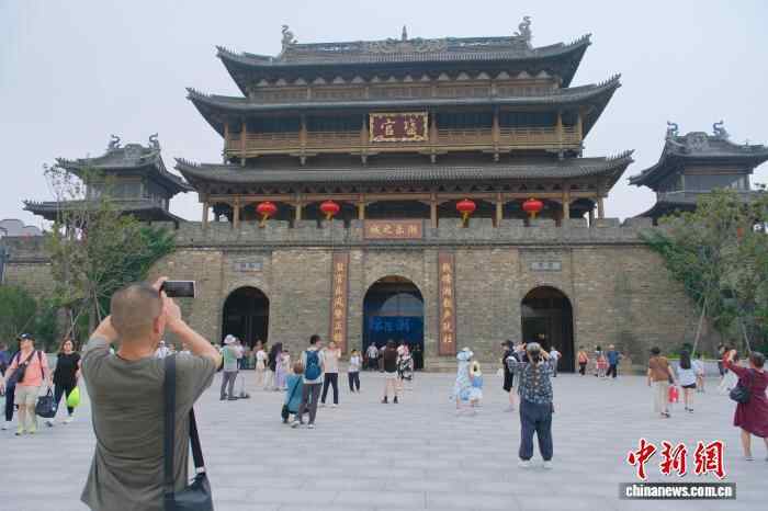 10月7日,游客在古城前拍照。当日是农历八月十六,浙江省海宁市盐官镇迎来钱塘江大潮,这一自然奇观吸引了大量游客,并为坐落于江畔的“盐官古城—潮乐之城”注入了文旅新活力。中新社记者 曹丹 摄