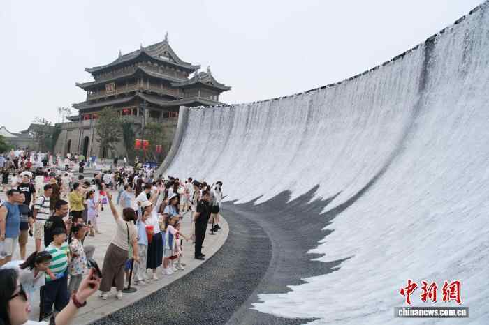 10月7日,游客在古城“潮墙”前拍照。当日是农历八月十六,浙江省海宁市盐官镇迎来钱塘江大潮,这一自然奇观吸引了大量游客,并为坐落于江畔的“盐官古城—潮乐之城”注入了文旅新活力。中新社记者 曹丹 摄