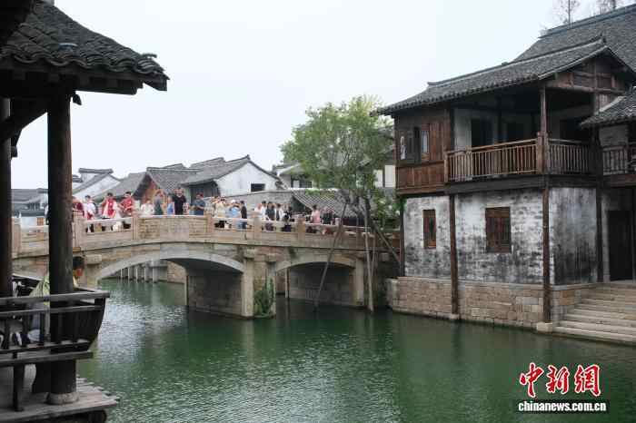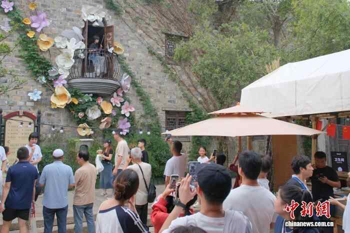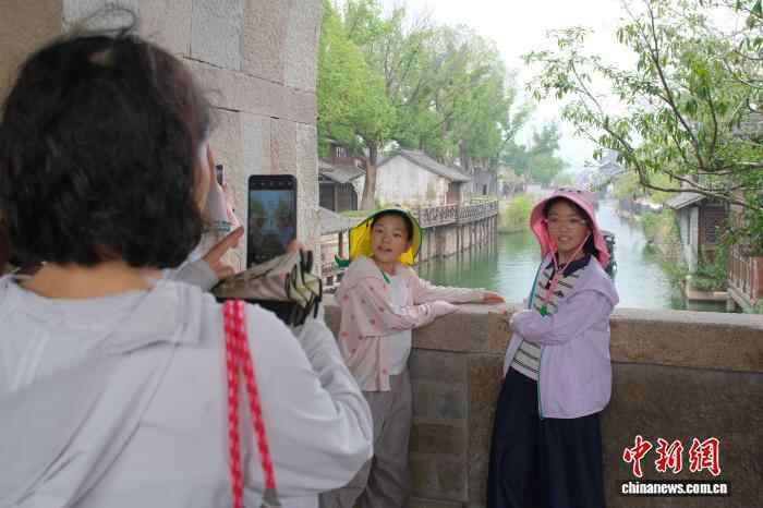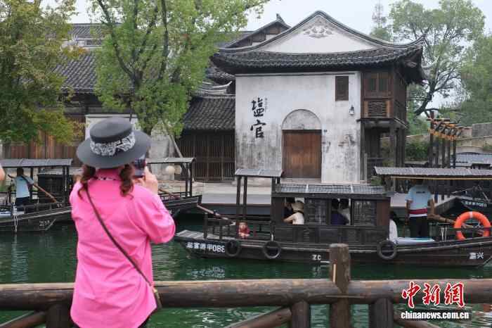 10月7日,游客在古城内拍照。当日是农历八月十六,浙江省海宁市盐官镇迎来钱塘江大潮,这一自然奇观吸引了大量游客,并为坐落于江畔的“盐官古城—潮乐之城”注入了文旅新活力。中新社记者 曹丹 摄