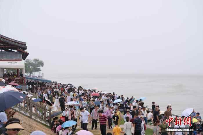 10月7日,游客在江畔等待钱塘江大潮。当日是农历八月十六,浙江省海宁市盐官镇迎来钱塘江大潮,这一自然奇观吸引了大量游客,并为坐落于江畔的“盐官古城—潮乐之城”注入了文旅新活力。中新社记者 曹丹 摄