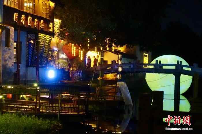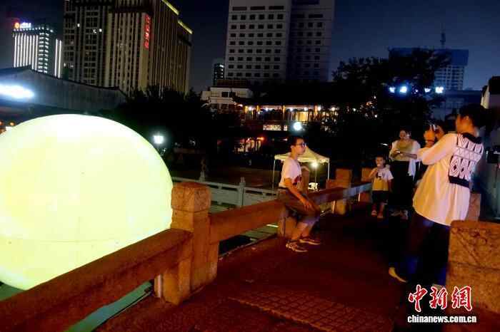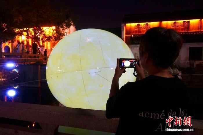 10月7日,小西街旁的河中放置着“圆月”,吸引游客拍照。中新社记者 钱晨菲 摄