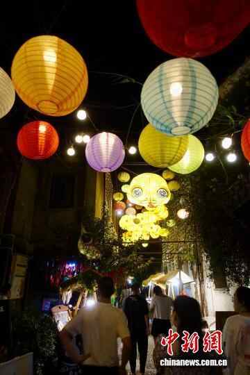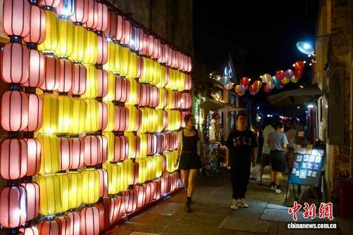 10月7日,游客在彩灯下闲逛。中新社记者 钱晨菲 摄