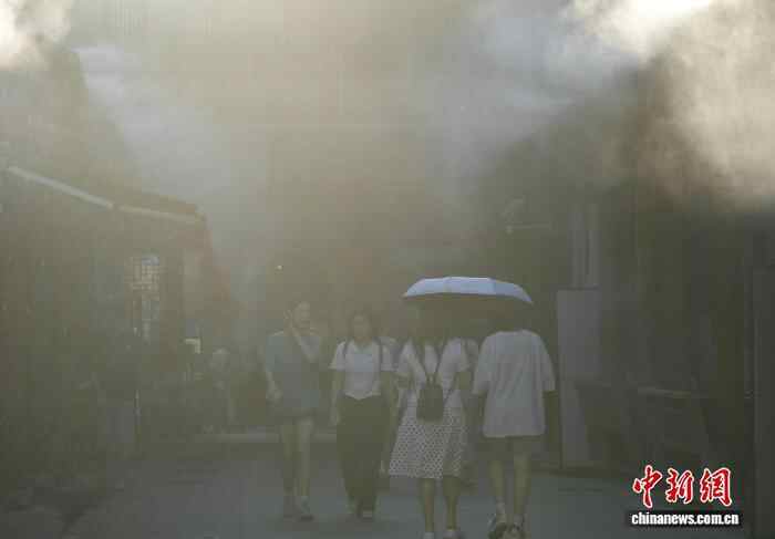 10月7日,福州街头一处喷水雾装置,为出行的民众降温。国庆中秋假期,受副热带高压控制,福州持续晴热高温天气,热力十足。中新社记者 张斌 摄
