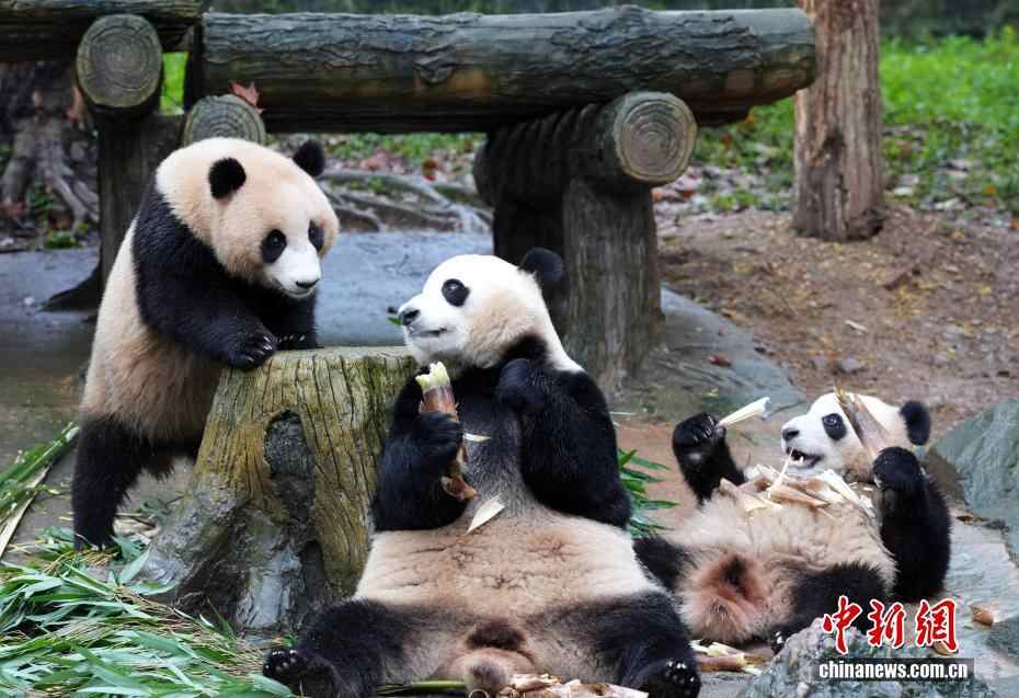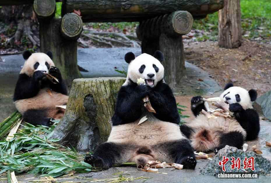 10月7日,四川都江堰,大熊猫“蕊蕊”一家在享用美食。当日是国庆假期第七天,众多市民、游客来到中国大熊猫保护研究中心都江堰基地参观,都江堰基地里的大熊猫撒欢卖萌让游客开心不已。