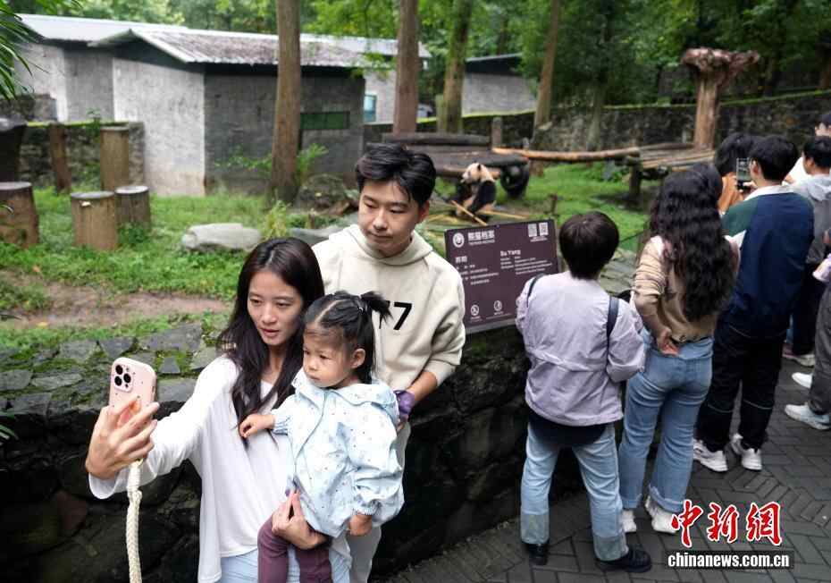 10月7日,四川都江堰,游客在都江堰基地参观。当日是国庆假期第七天,众多市民、游客来到中国大熊猫保护研究中心都江堰基地参观,都江堰基地里的大熊猫撒欢卖萌让游客开心不已。