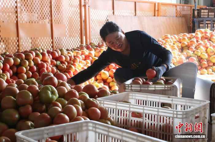 10月7日,工作人员在宁夏银川市金凤区良田镇和顺新村果蔬仓储分拣中心将西红柿分拣装箱。中新社记者 于晶 摄
