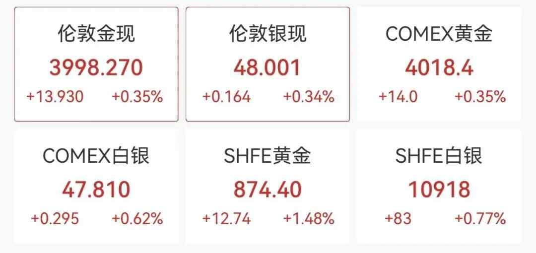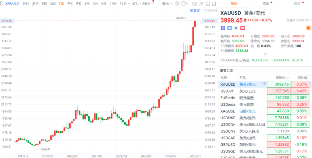 10月8日早盘,黄金期现货集体走高,现货黄金突破4000美元/盎司大关,续创新高,年内涨幅超52%;COMEX黄金期货持续走高,现报4018.4美元/盎司。