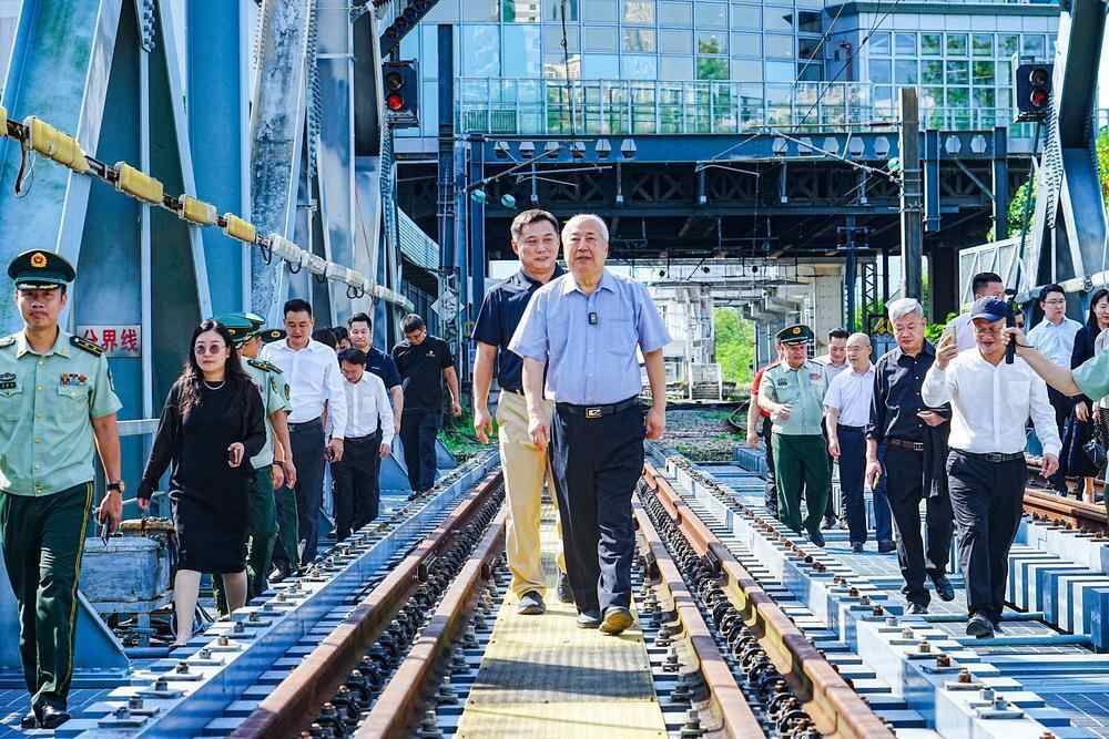 上午9时30分,钱永刚和武警官兵一起走上罗湖桥,向官兵介绍自己和父亲钱学森归国的艰辛历程,“70年前我们就是通过罗湖桥回到祖国的怀抱”,钱永刚边说边指着河上的铁桥介绍。
