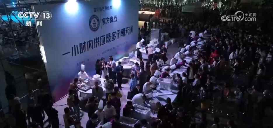 当晚活动的最大亮点当属与开幕式同步启动的吉尼斯世界纪录挑战——“一小时内现场制作并发放朝天锅数量最多”。朝天锅是潍坊名吃,主要是汤配卷饼。三口直径超2米的巨型朝天锅热气升腾,20名专业厨师默契配合完成食材处理、卷饼制作。按照规则,需在一小时内完成2500份卷饼的制作与发放。