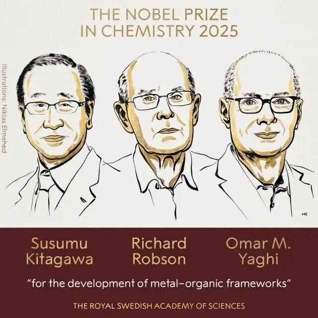 当地时间10月8日,瑞典皇家科学院决定将2025年诺贝尔化学奖授予北川进(Susumu Kitagawa)、理查德·罗布森(Richard Robson)以及奥马尔·M·亚吉(Omar M. Yaghi)三位科学家,以表彰其在金属有机骨架开发领域的贡献。