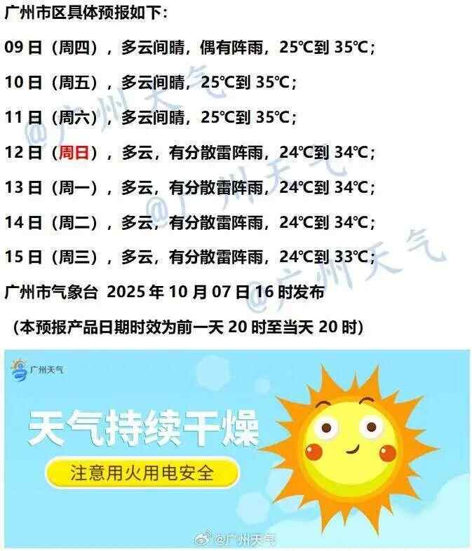 据广东气象台10月8日19时预报,预计9-11日,广东大部晴到多云为主,粤西多云间阴天有分散小雨。最高气温:粤西31~33℃,其余市县33~36℃,局部37℃。