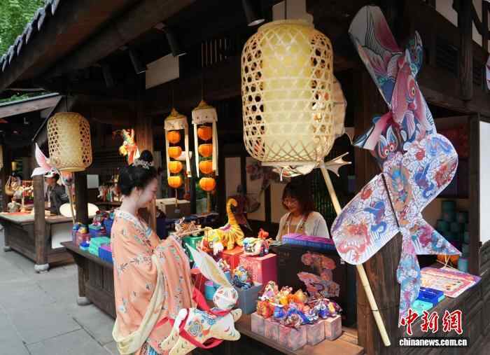 10月2日,四川成都,游客在杜甫草堂“广厦十二间”手工艺文创市集选购文创商品。中新社记者 安源 摄
