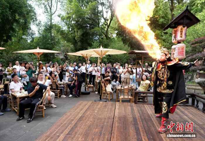 10月2日,四川成都,游客在杜甫草堂观看吐火表演。中新社记者 安源 摄