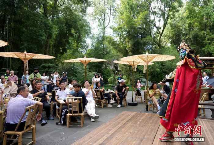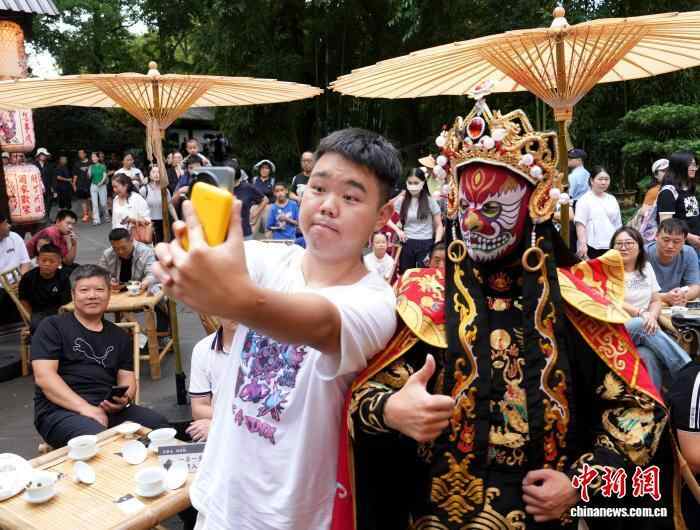10月2日,四川成都,游客在杜甫草堂观看变脸表演。中新社记者 安源 摄