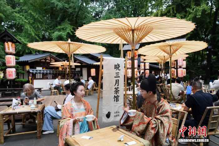 10月2日,四川成都,游客身着古装在杜甫草堂品茶。中新社记者 安源 摄