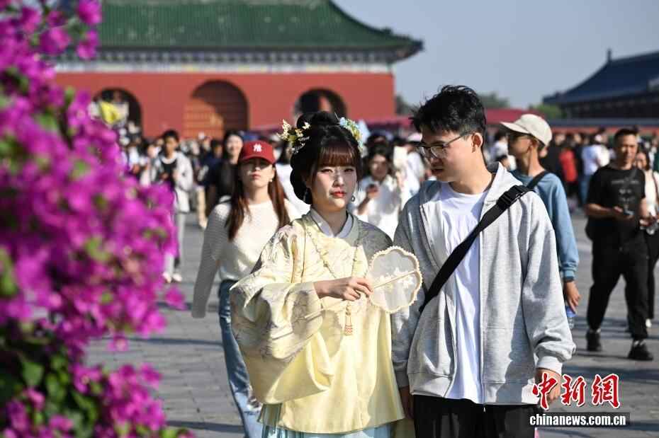 10月2日,游客在天坛公园游览。当日是国庆假期第二天,北京多个景区游人如织。