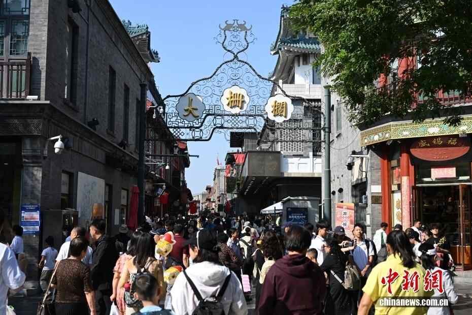 10月2日,游客在前门步行街游览、拍照。当日是国庆假期第二天,北京多个景区游人如织。