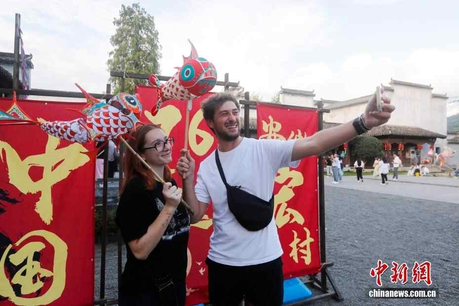 10月1日,国庆长假首日,世界文化遗产地安徽省黄山市黟县宏村迎来旅游热。典雅的徽派建筑与灵动水乡相映成趣,尽显古村魅力。图为来自法国的游客在宏村打卡体验鱼灯。