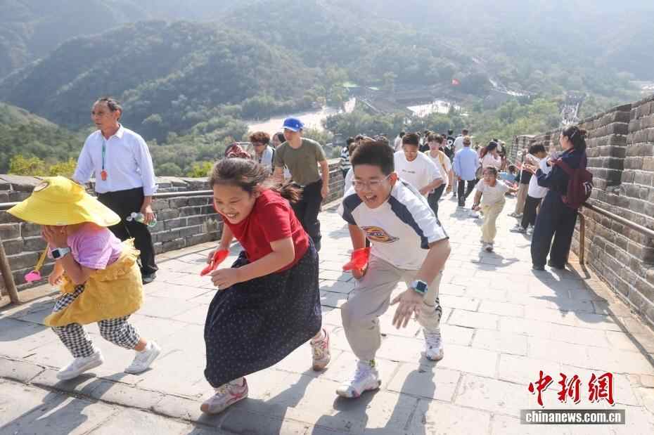 10月2日,国庆中秋假期第二天,北京八达岭长城景区人气旺。图为几名小游客比拼快速登长城。