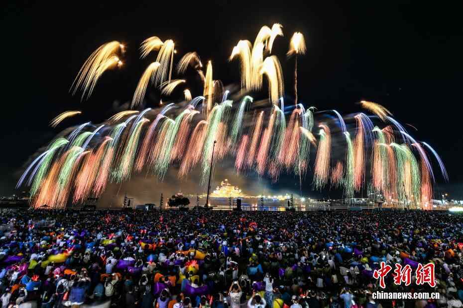 10月2日晚,天津滨海新区,市民和游客在泰达航母主题公园观看无人机焰火秀。国庆假期,天津泰达航母主题公园推出的“津彩盛焰·礼赞祖国”大型沉浸式无人机焰火秀表演,成为国庆假期滨城文旅热门打卡项目。