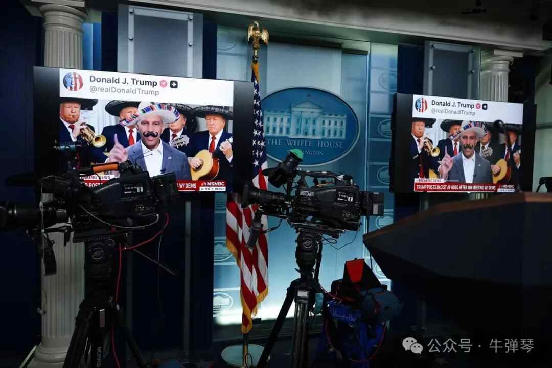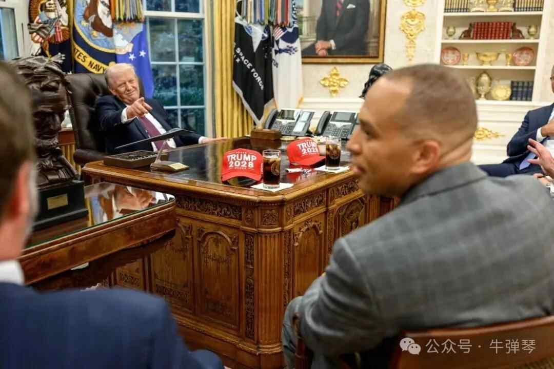 但图片显示,特朗普办公桌上,摆着两顶红帽子,“特朗普2028”,直接冲着民主党领袖。