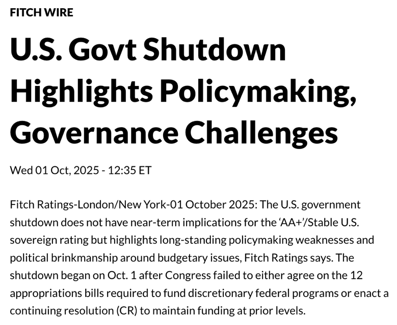 事实上,信贷评级机构早就把这种政治不确定性纳入了考量。2023年,惠誉下调美国主权评级时,就特别提到预算和预算谈判过程的“高风险”特征。本轮停摆开始后,惠誉又发文称,虽然短期内停摆不会影响美国AA+主权评级,但停摆凸显了更深层的政策制定与治理结构挑战。报告还警告说,如果停摆持续,更长期的公共财政信用将可能承压。