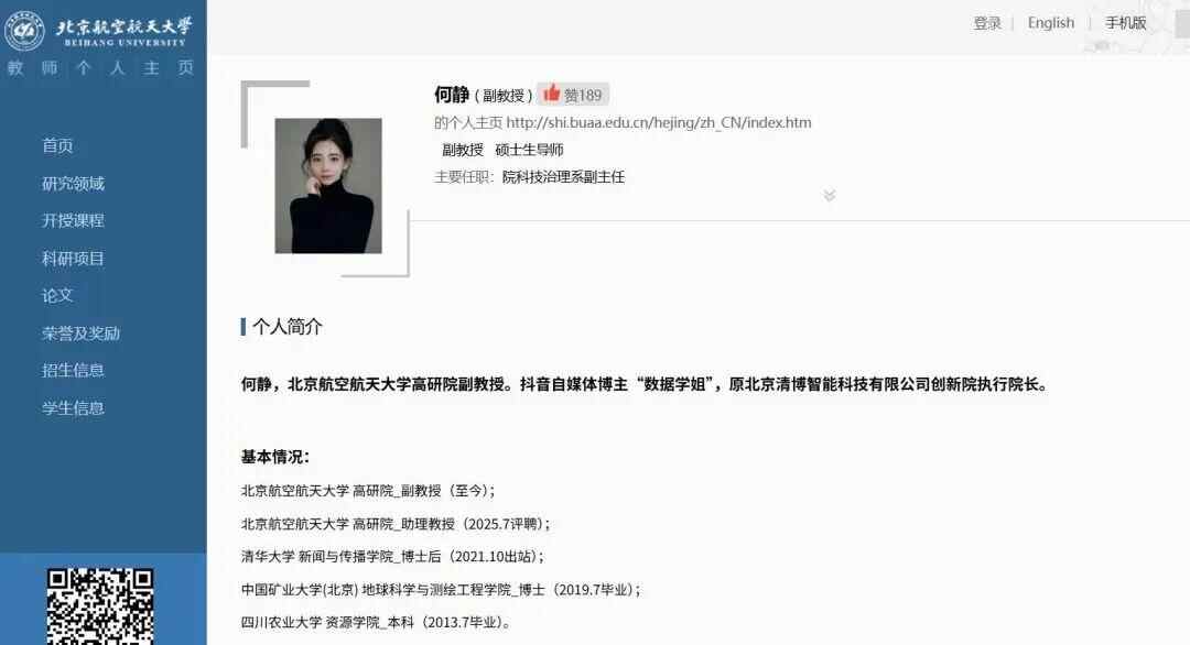 北航高研院官网显示:何静,北航高研院科技治理中心副主任、副教授,也是抖音自媒体博主“数据学姐”,原北京清博智能科技有限公司创新院执行院长。其主持国家自然科学基金、中国博士后基金(特别资助/面上)、北京市社会科学基金等20余项课题;发表论文40余篇。其中,以第一/通讯身份发表SCI/SSCI/CSSCI论文10余篇。