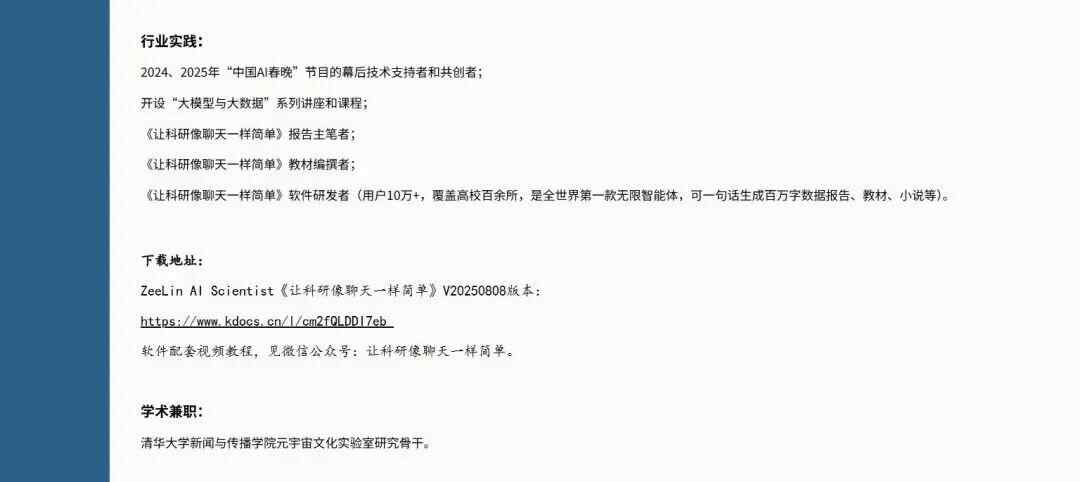 她还是《让科研像聊天一样简单》报告主笔者、教材编撰者,《让科研像聊天一样简单》软件研发者(用户10万+,覆盖高校百余所,是全世界第一款无限智能体,可一句话生成百万字数据报告、教材、小说等)。