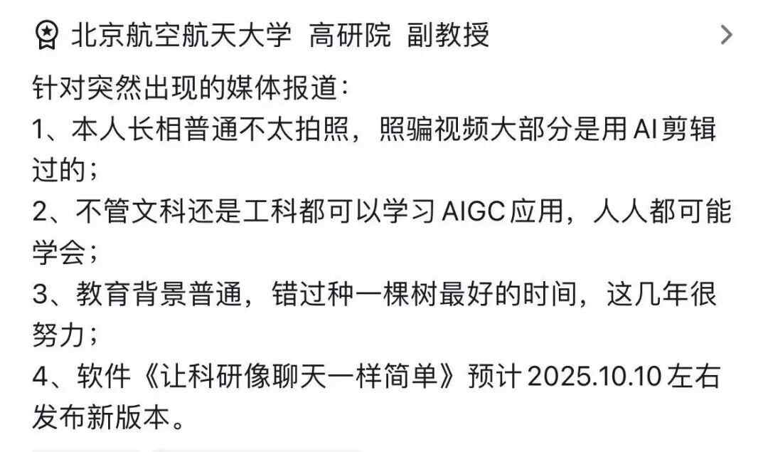据极目新闻报道,10月1日,记者了解到,这名授课老师名叫何静,2021年10月从清华大学新闻传播学博士后出站,现为北航人文与社会科学高等研究院(以下简称“高研院”)科技治理中心副主任、副教授。官网教师个人主页显示,她还是2024、2025年“中国AI春晚”节目的幕后技术支持者和共创者。