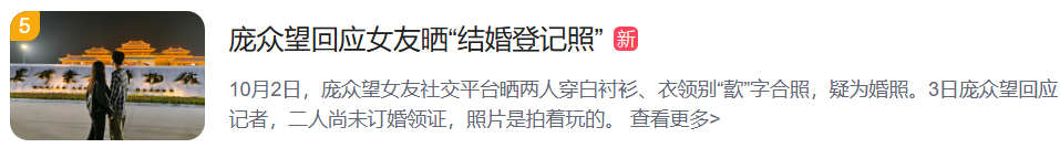 10月2日,庞众望女友晒合照,因两人穿白衬衫衣领别“歖”被猜测拍领证照、好事将近。对此,庞众望称照片只是拍着玩的,两人目前还没有订婚领证。