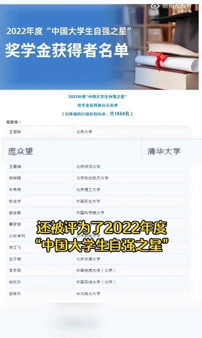 资料显示,庞众望,河北沧州市吴桥县沟店铺乡庞庄村人,2017年高考,庞众望考出了理科684分的成绩,并获得清华大学“自强计划”最高60分的降分录取资格。2021年,庞众望本科毕业后,继续留在清华大学精密仪器系攻读博士学位。他多次获得清华大学奖学金,还被评选为2022年度“中国大学生自强之星”。博士研究生期间,庞众望除了发表SCI(科学引文索引)论文,还获得了国家发明专利三项。他从事的光网络信息感知相关研究,面向的是国家重大科技需求。
