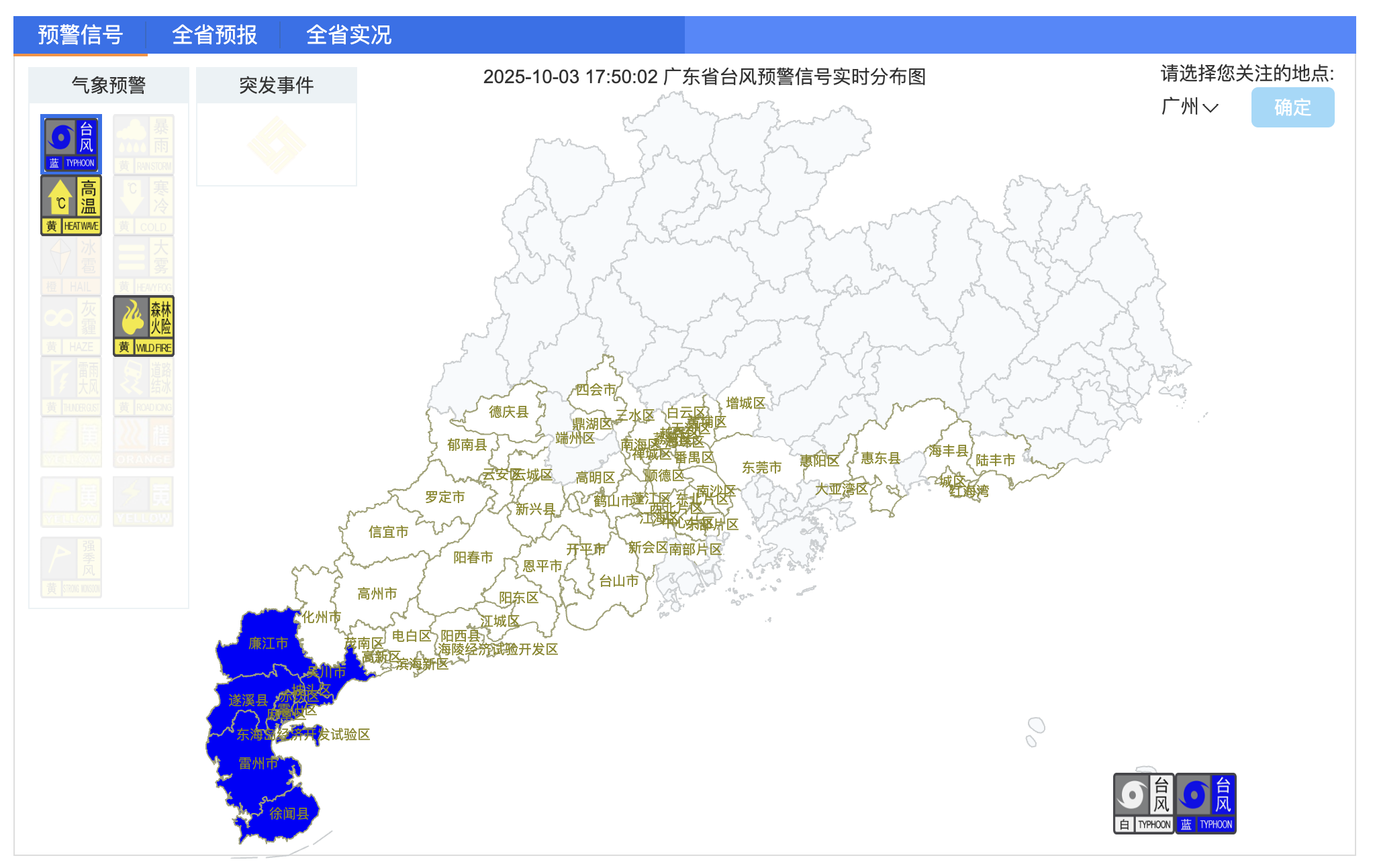 截至10月3日17时50分,广东最高台风预警信号已发布至蓝色。其中湛江全市发布台风蓝色预警信号,茂名、阳江、云浮、江门、肇庆、佛山、中山、广州、东莞、惠州、汕尾等地,有市县区发布台风白色预警信号。