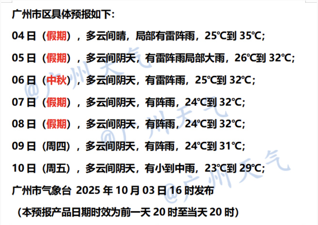 广州市气象台预计,4日白天广州高温炎热天气持续,局部有雷阵雨。预计4日夜间至6日,受“麦德姆”影响,广州有雷阵雨局部大雨,广州港区阵风加大至7~9级,陆地阵风加大至6~8级。预计6日中秋节当天稍晚时间,广州转多云间晴天气,夜间可见月光。