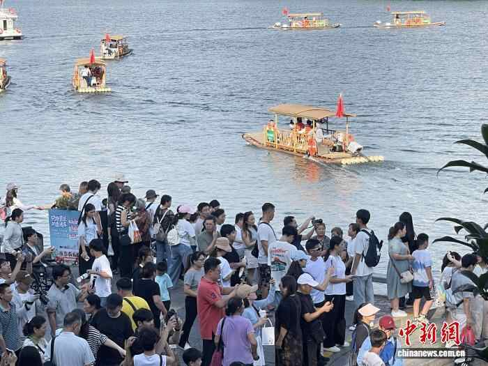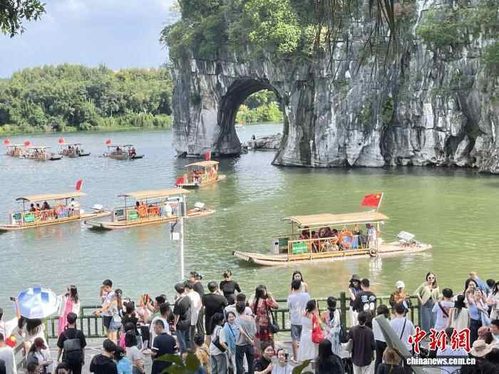 10月1日,广西桂林市象鼻山景区迎来客流高峰。山水之间洋溢着浓厚的节日氛围。桂林城徽象鼻山在国庆期间成为热门打卡地,游客们在此欣赏山水美景,感受自然风光,欢度国庆假期,在绿水青山间表达对祖国的美好祝福。图为国庆假期首日,游客在象鼻山景区乘坐竹筏游览。何茜 摄